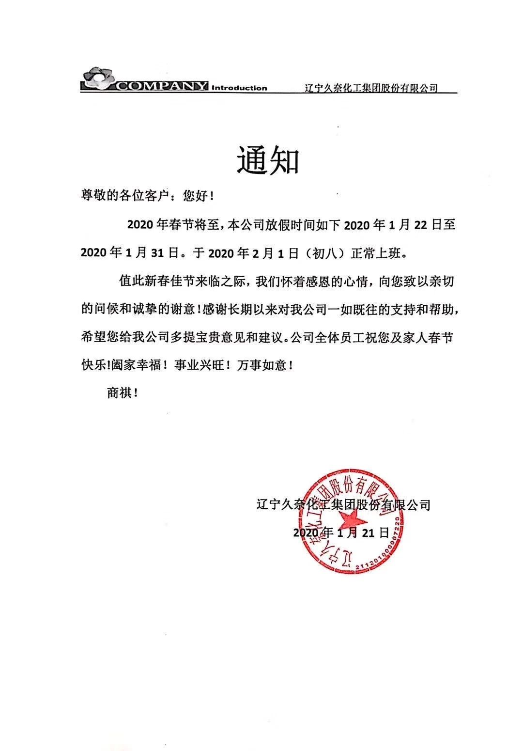 遼寧久奈化工集團(tuán)股份有限公司春節(jié)放假通知