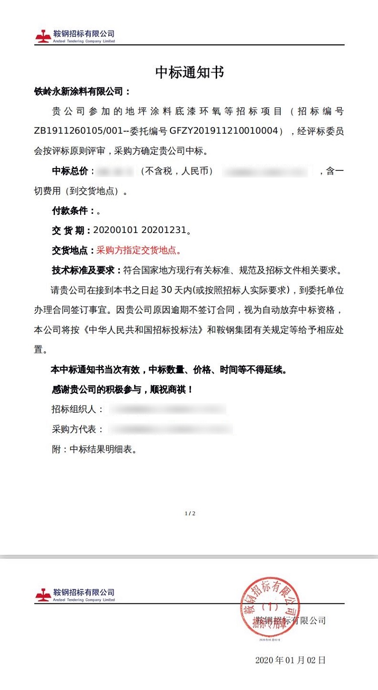 鞍鋼中標(biāo)通知書